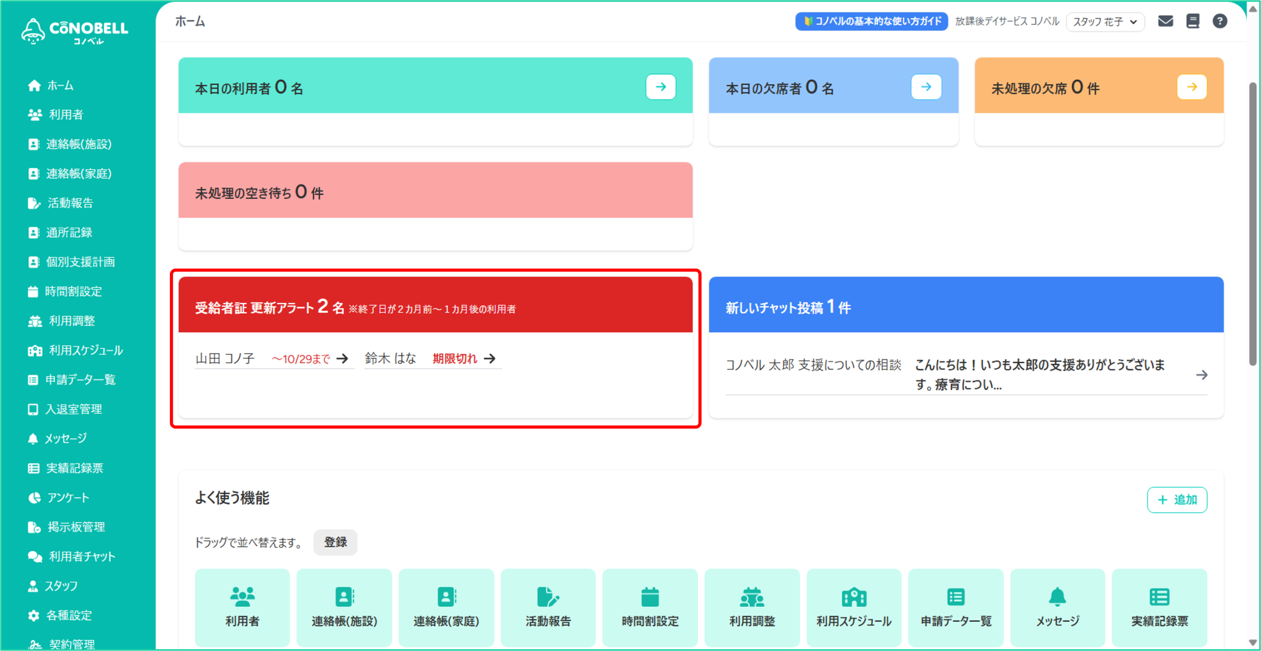 コノベリストプラン(有料)の場合、受給者証情報の「契約終了日」が、現在の日付から 2か月前〜1か月後の期間にあたる利用者は、ホーム画面の「受給者証更新アラート」に自動で表示されます。