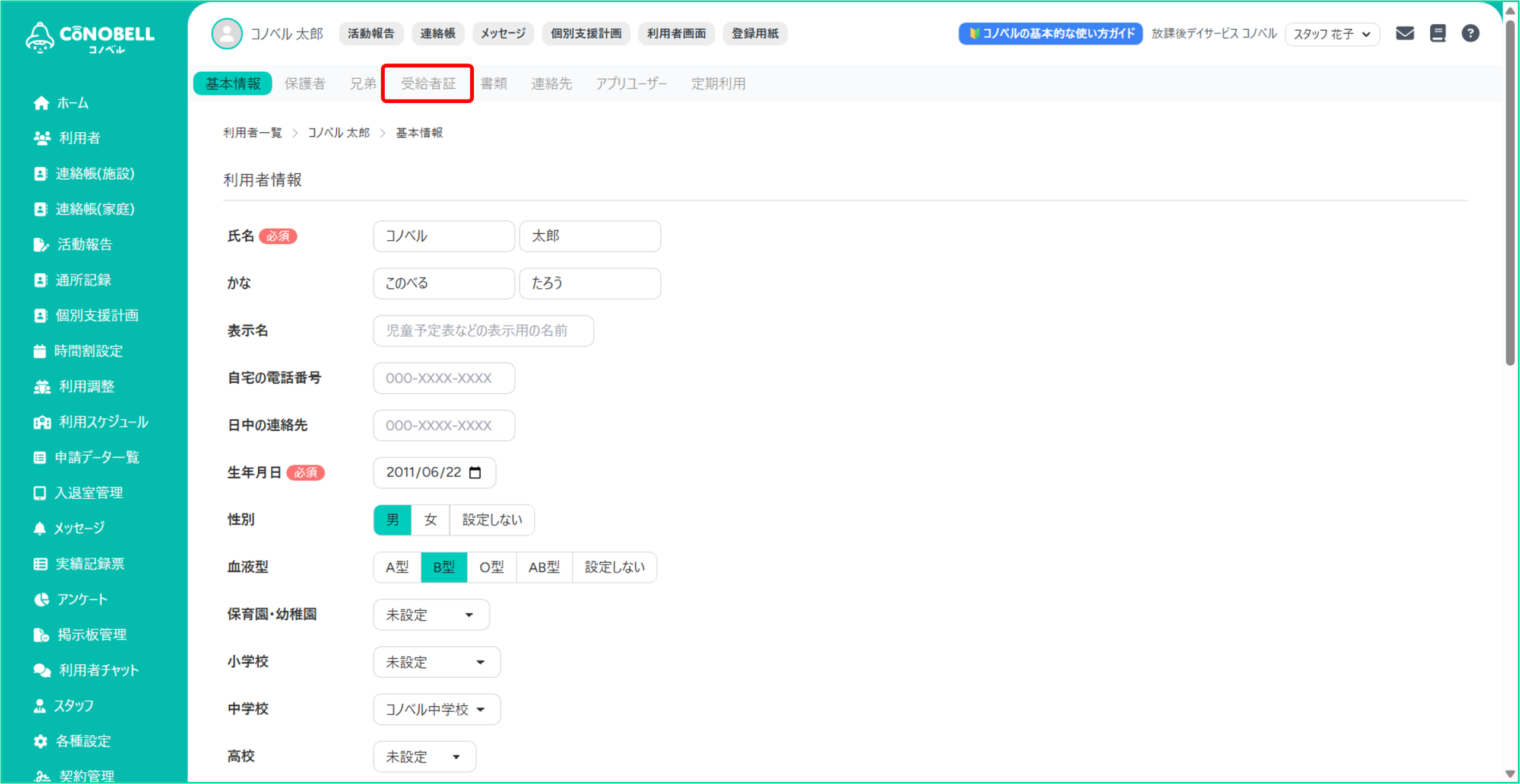 受給者証情報を登録しておくと、実績記録票機能にもこの情報が反映されます。