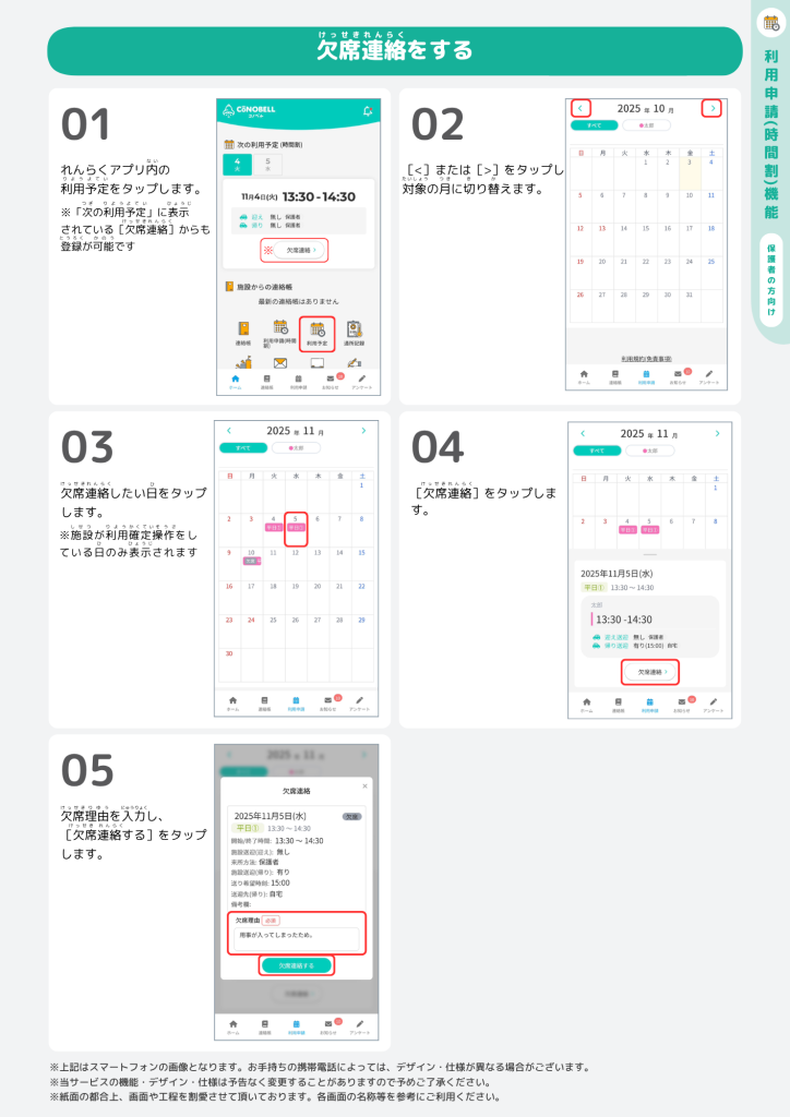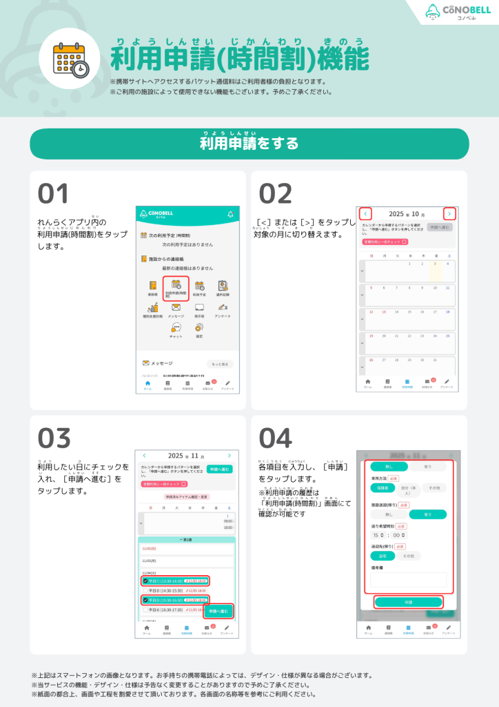このマニュアルでは、れんらくアプリでの利用申請(時間割版)の操作方法について説明します。