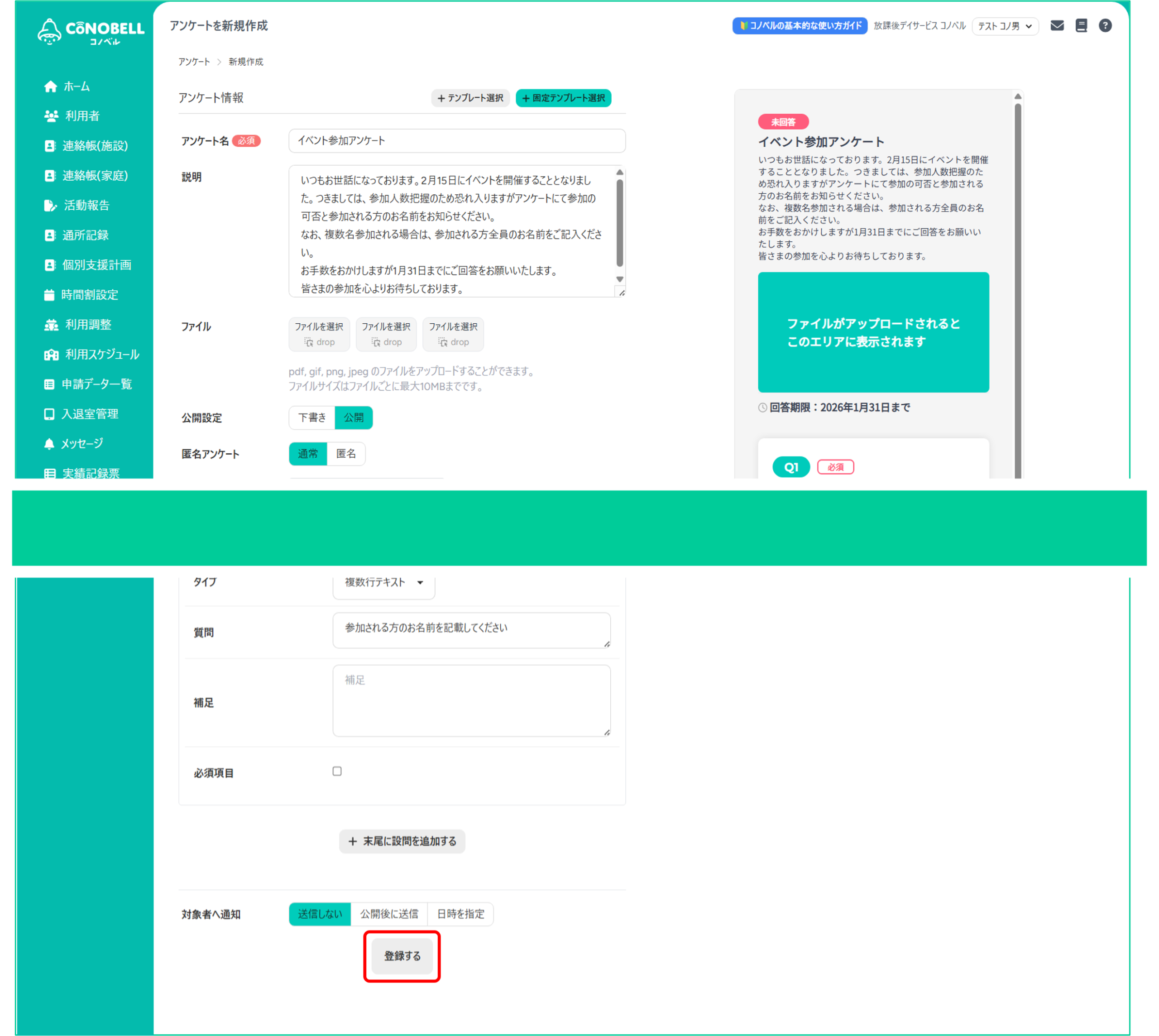 ④公開設定などを入力し[登録する]をクリック、対象者を設定に進んでください