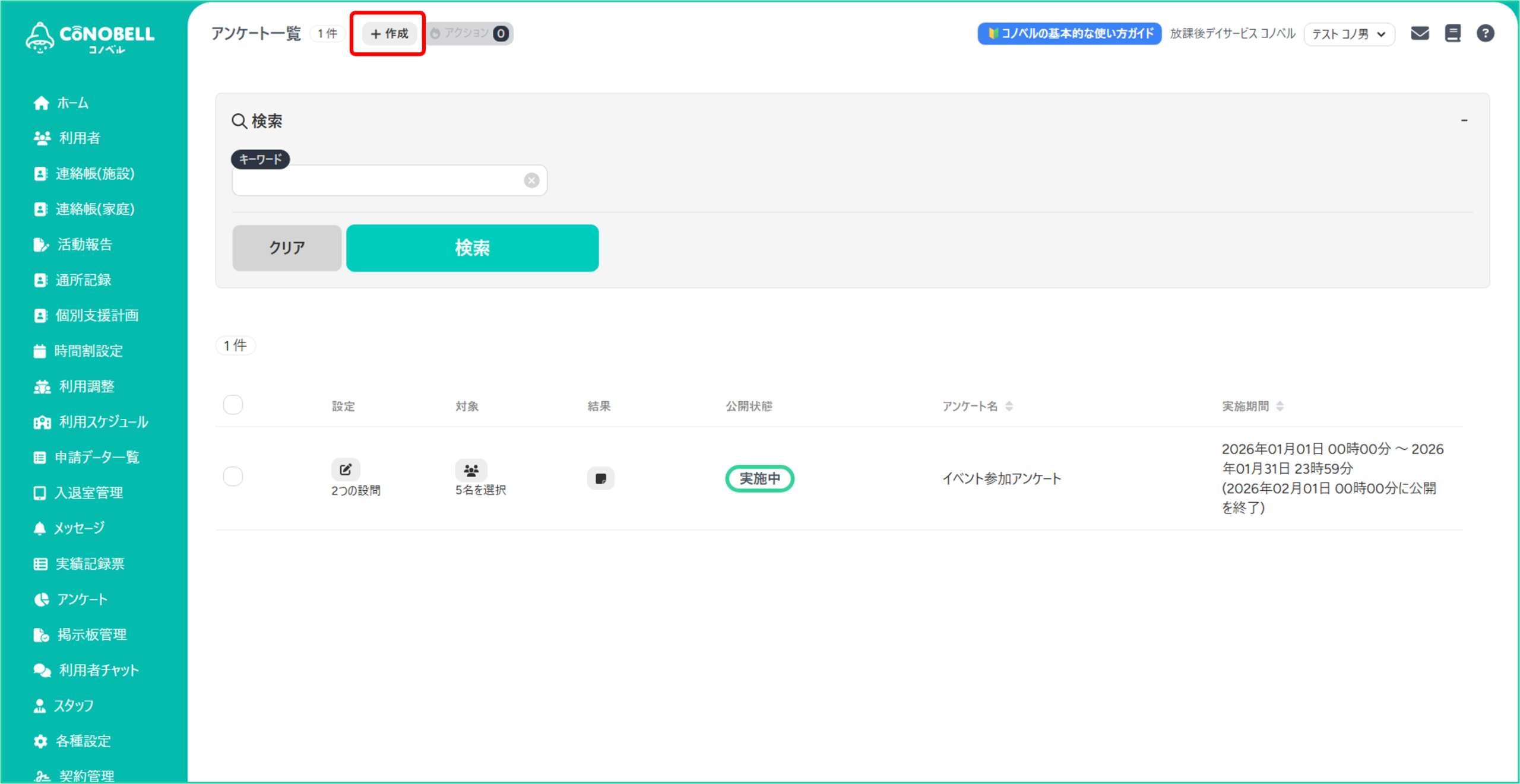 ①管理画面からアンケートを開き、「+作成」をクリック