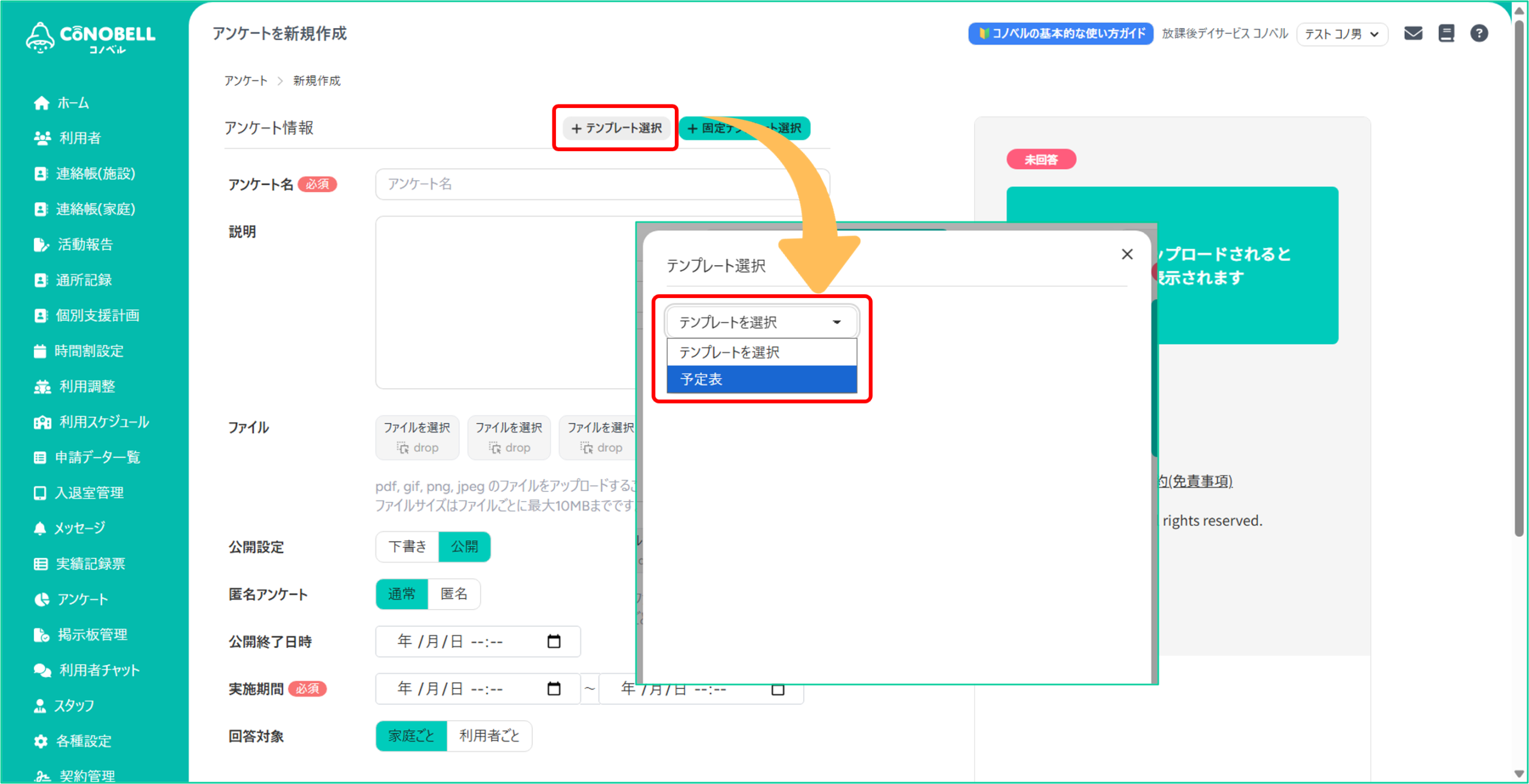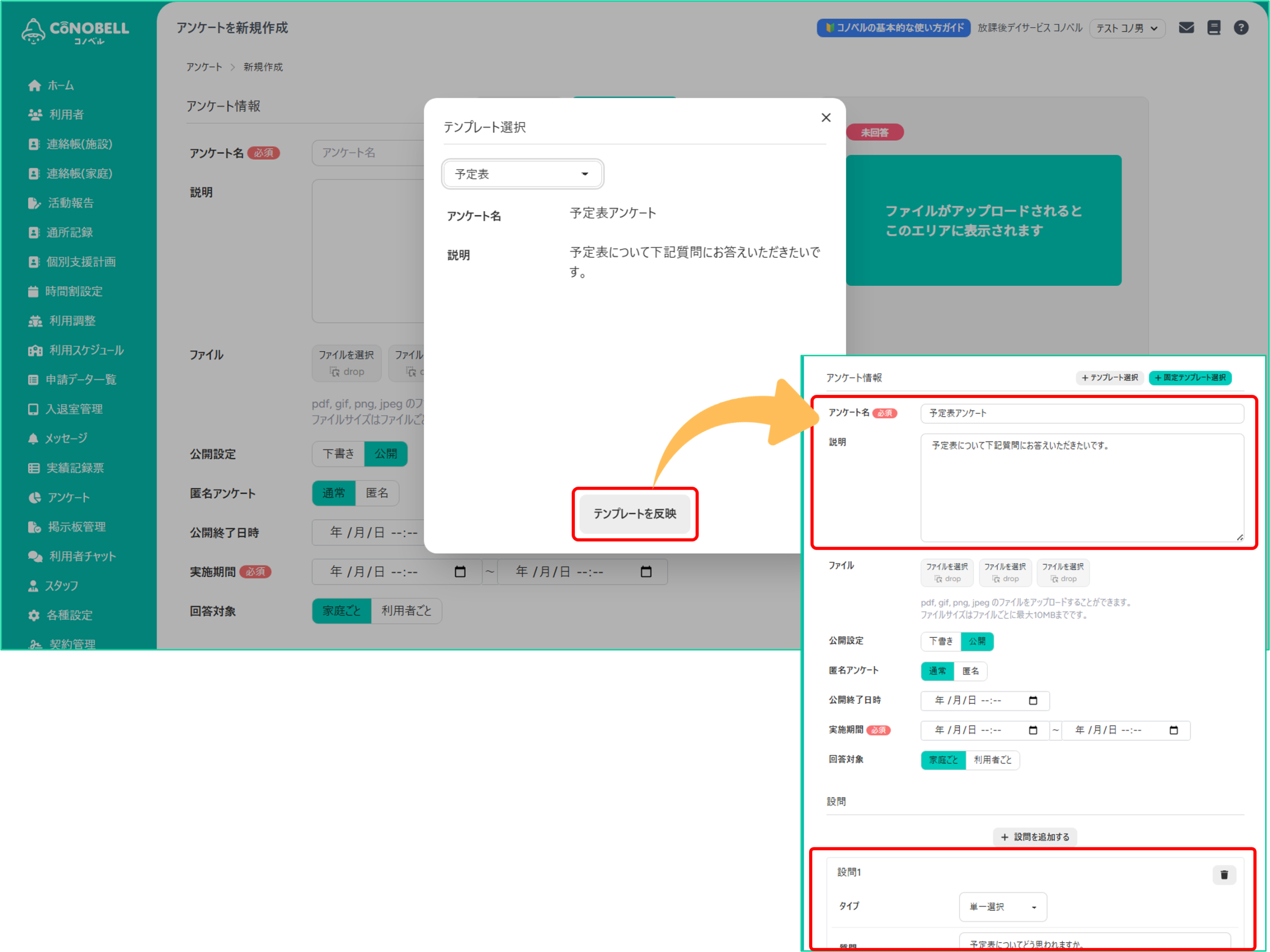 ③[テンプレートを反映]をクリックするとアンケート名や設問が自動で反映されます