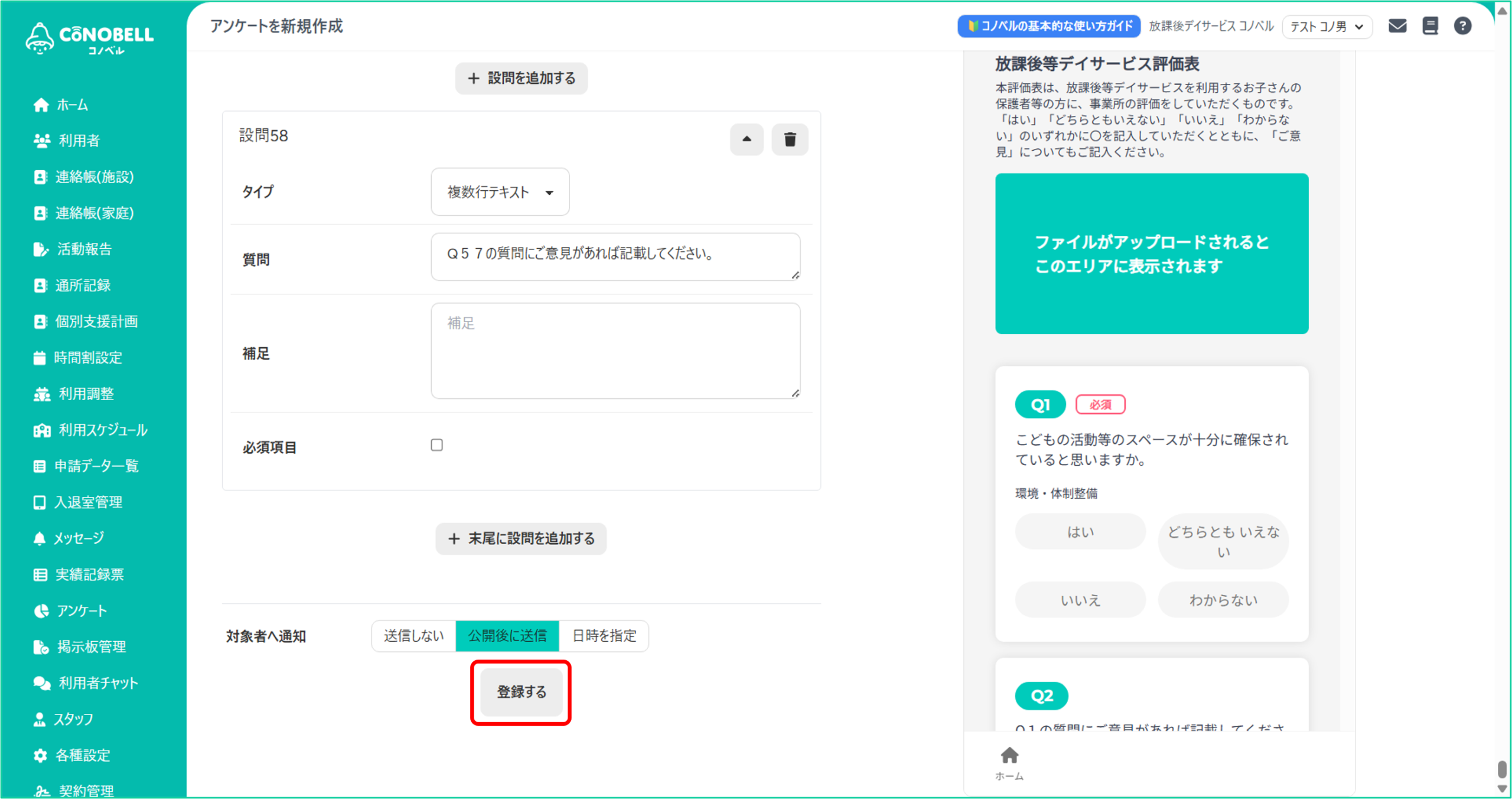 ③アンケート内容を入力し[登録する]をクリック