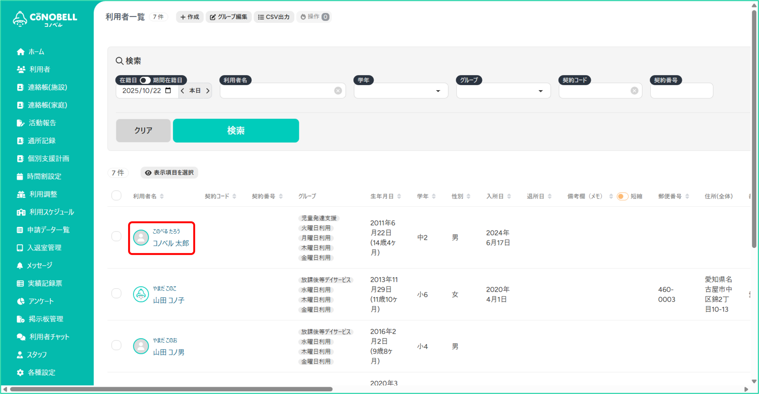 ①利用者一覧画面にて、対象の「利用者名」をクリック