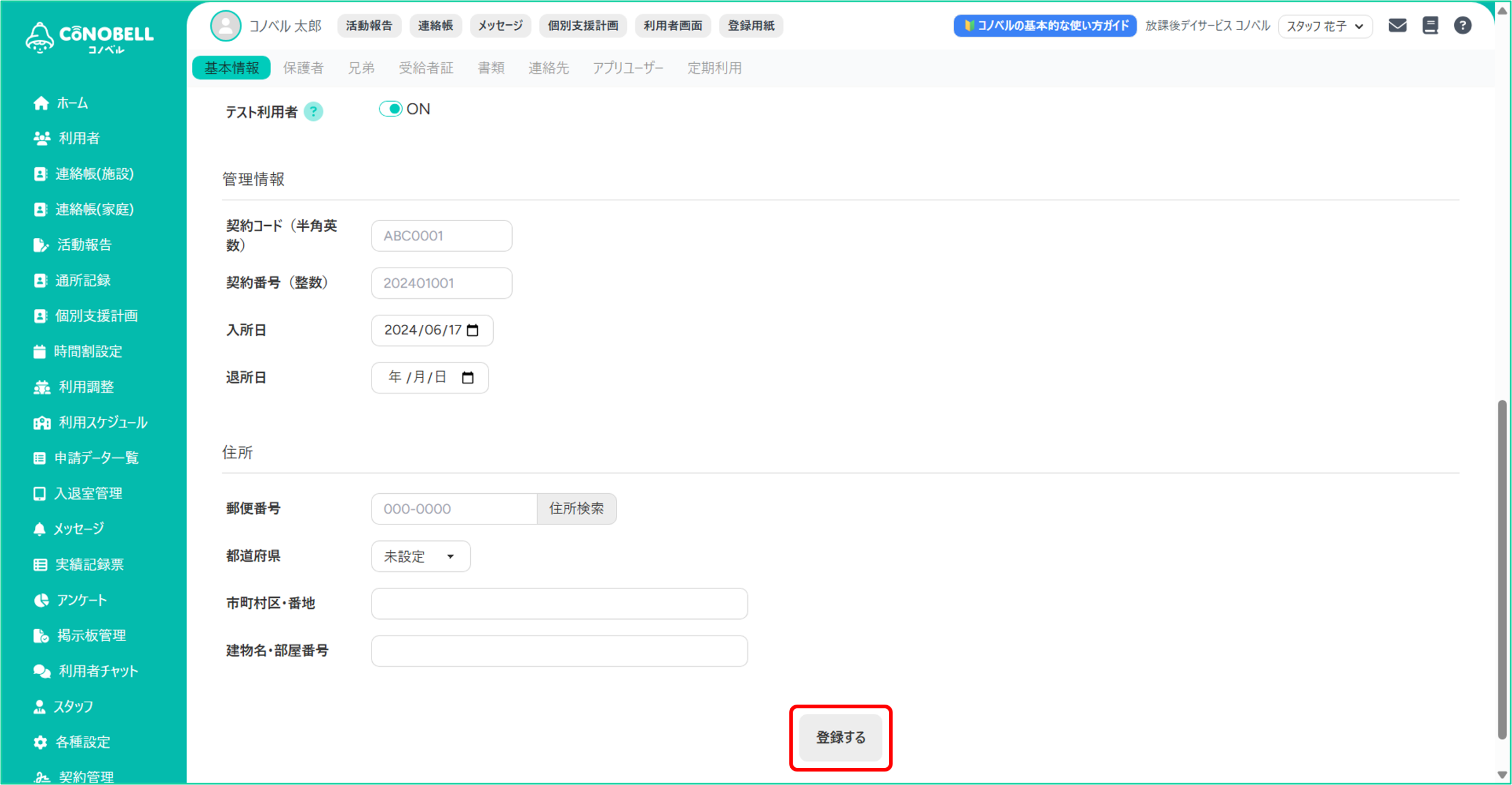 実績記録票機能にも反映されますので、「保護者 1」の「氏名」には、利用者の受給者証に記載されている「受給決定保護者」の名前を登録することを推奨いたします。