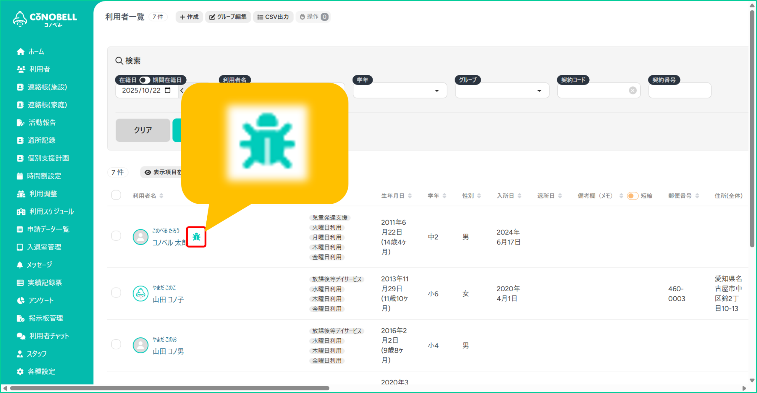 ▼テスト利用者の場合、利用者一覧画面上に虫マークが表示されます